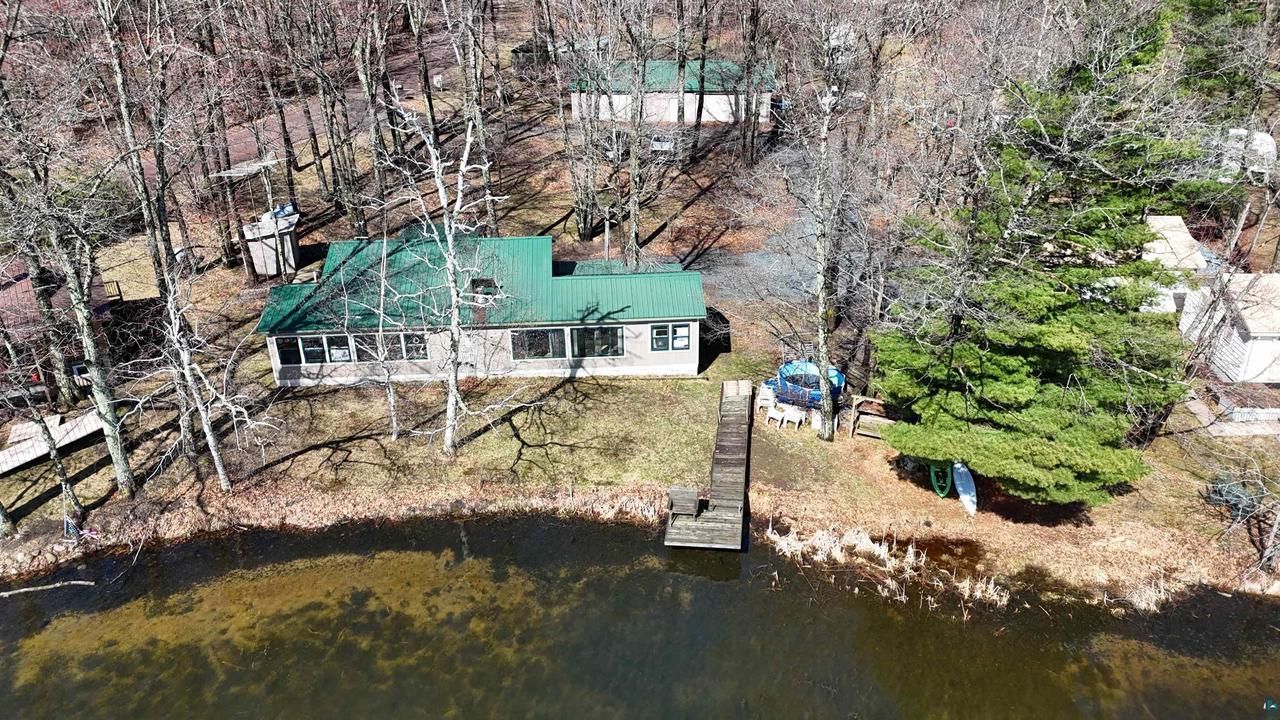 Welcome to 6030 Lake Ahmeek Road ? a lakefront retreat on 1.5 wooded acres with 100 feet of sandy shoreline on Iron Lake. The home sits just steps from the water, with no road between you and the beach. Inside, a spacious living room stretches along the lakefront beneath a vaulted ceiling, anchored by a wood stove and framed by oversized picture windows that put the lake on full display. The large eat-in kitchen features a center island with seating and connects seamlessly to the living space. A hallway leads to the owner's suite ? lined with windows overlooking the lake ? along with a full bathroom and a second bedroom. The home features 2x6 construction, and features an r20 wall insulation rating, reducing heating and cooling costs. Up the hill, this property reveals even more. A 4-stall detached garage sits on a cement slab with two overhead doors and an insulated section ready to be heated as a workshop. Tucked among the trees above the garage is a self-contained guest cottage offering a kitchenette, living area, full bathroom, and two bedrooms ? ideal for guests, rental income, or a private home office. The house, guest cabin and garage feature metal roofs, and mature hardwoods shade the grounds throughout. Iron Lake is a 247-acre lake in Bayfield County with a maximum depth of 20 feet and fishing for panfish, largemouth bass, northern pike, and walleye. Iron River is a gateway to thousands of miles of snowmobile and forest service trails, making this property an ideal year-round retreat for outdoor enthusiasts.